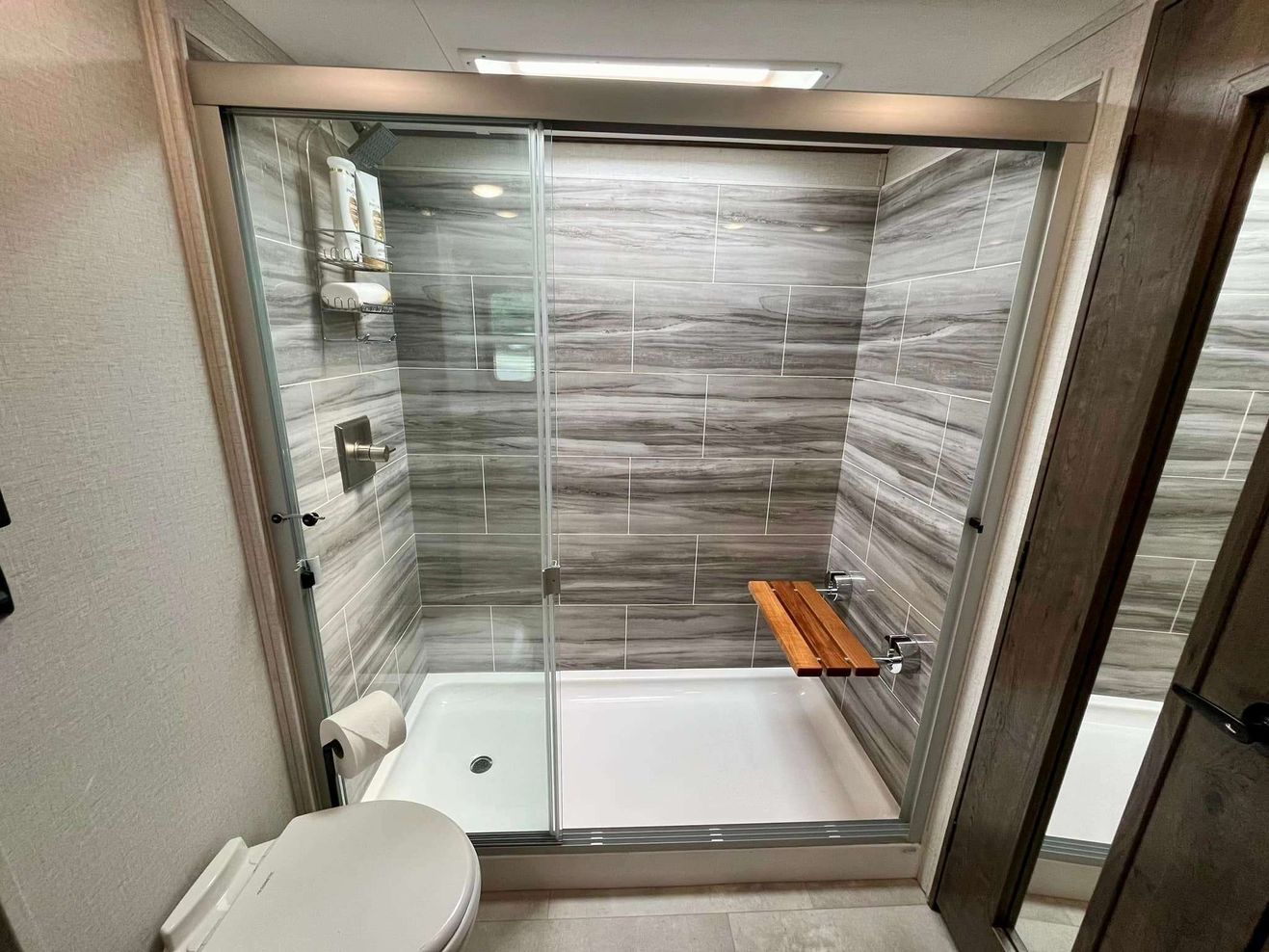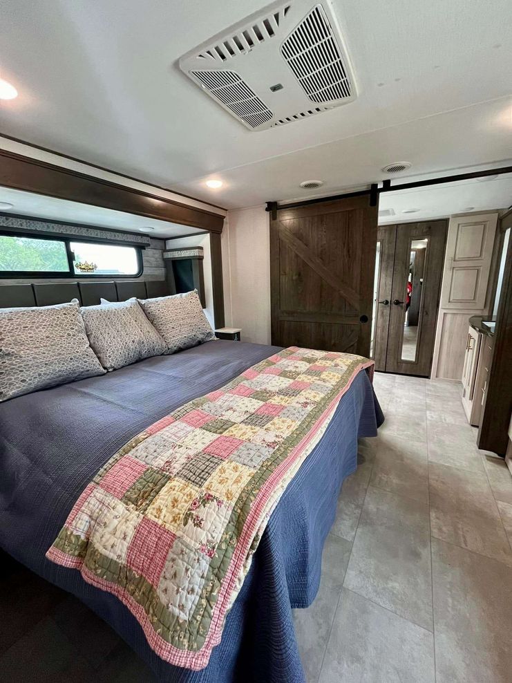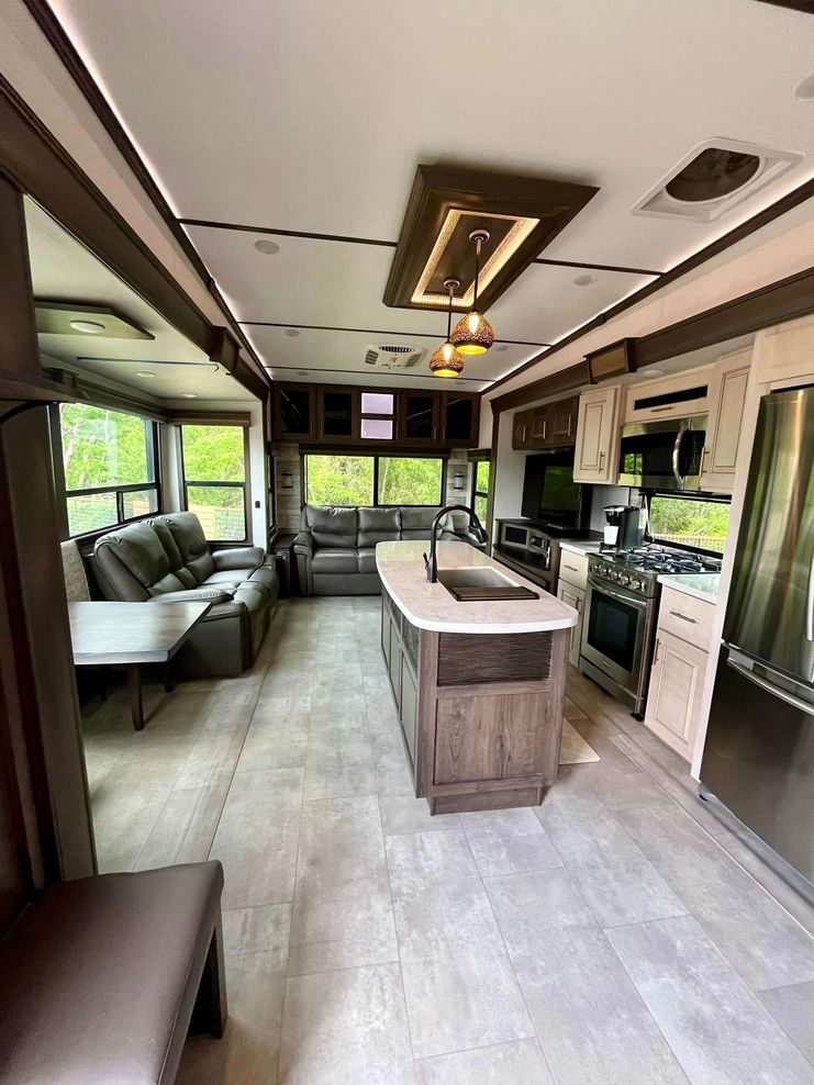 Front primary bedroom, mid kitchen, rear living room. 4 slide outs. Front full bathroom & mid 1/2 bath. Upgraded power recliners with tri-fold sofa. Solid step quad entry steps. 2 awnings in new condition. Good condition overall.